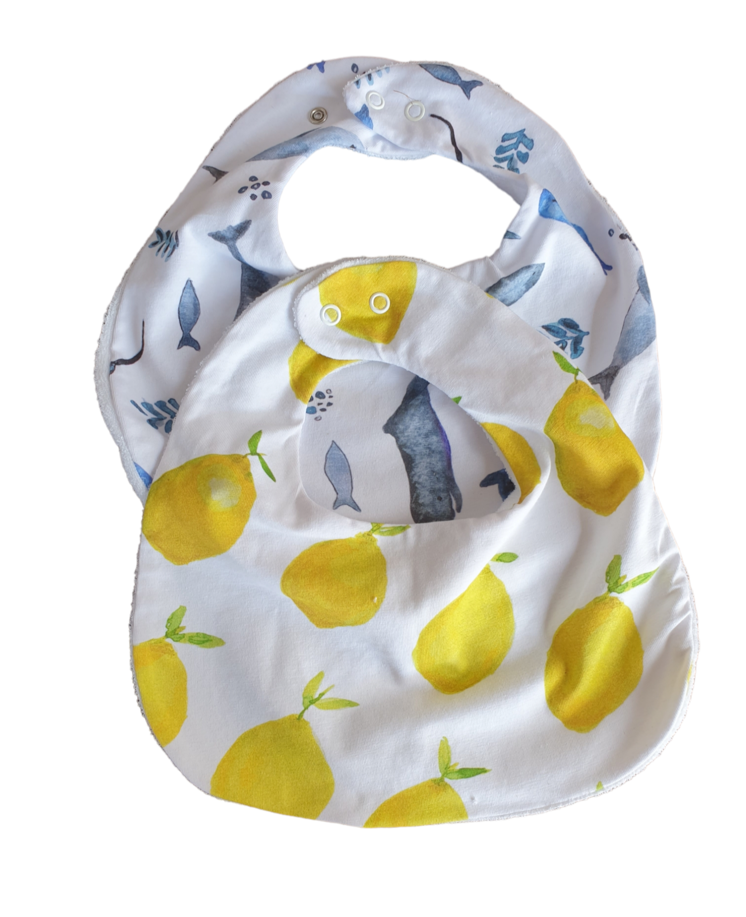 Our bibs are made from a soft cotton making them soft on the outside and lined with a rubberized toweling fabric to make them waterproof on the inside! They feature adjustable presstuds to easily adjust.