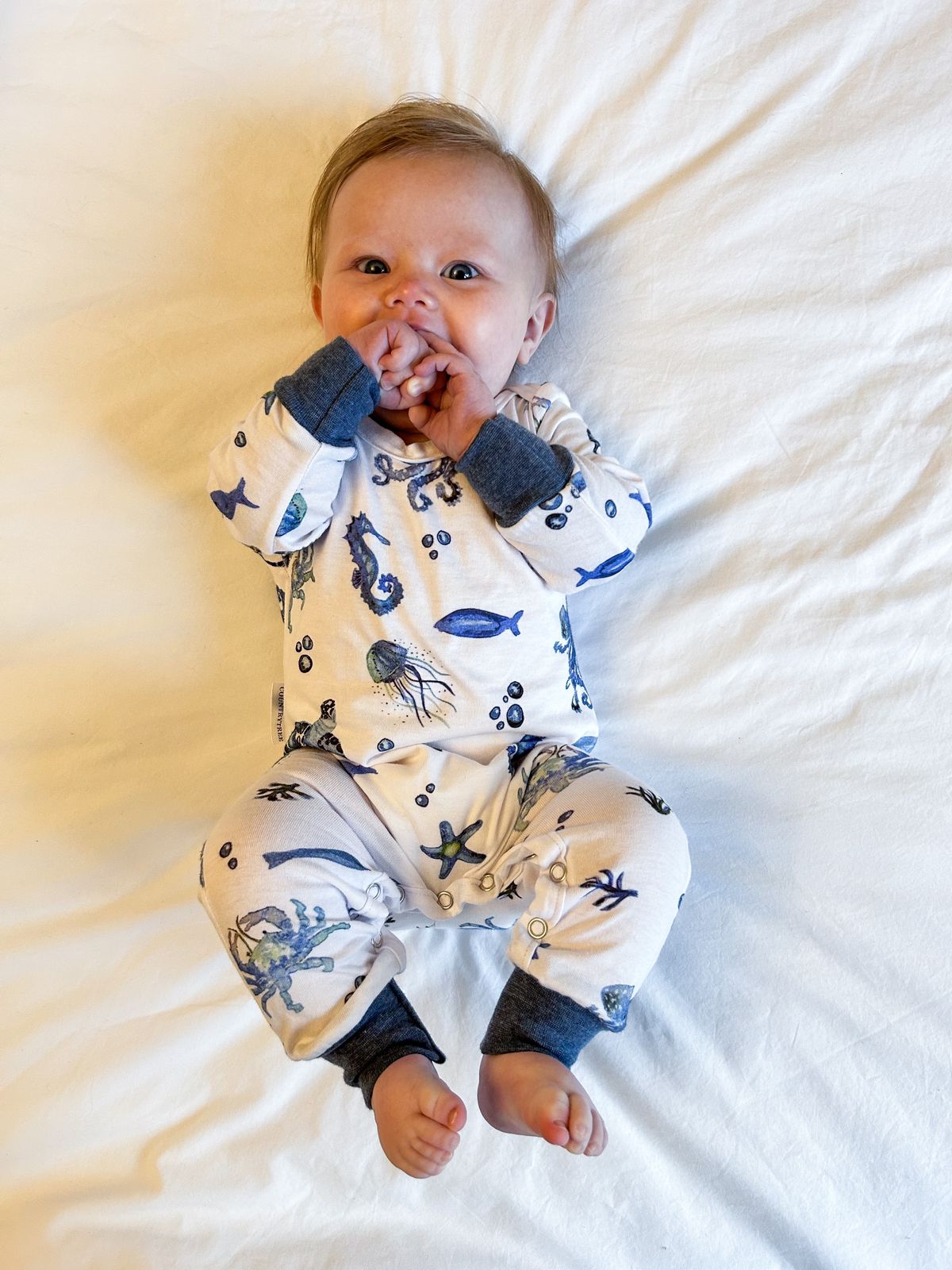 Our sleepsuits are made in 100% cotton jersey. It has a versatile neckline that slips over baby’s head easily with no fuss. The cuffs on sleeves and ankles are super stretchy so that it’s easy for you to get hold of baby’s hand or foot. For ease of nappy changes it comes with presstud closing in between the legs.